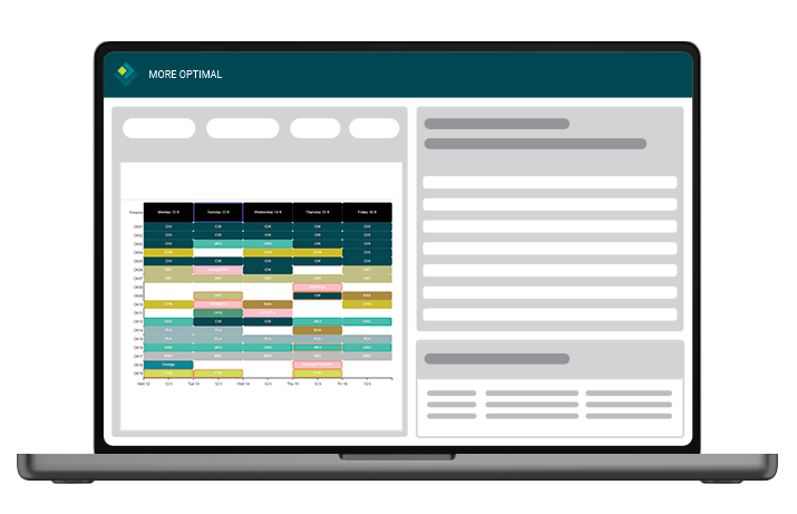 Your work is complex and involves balancing difficult decisions affecting the bottom line while trying to keep your medical staff and patients happy. If only you could see the big picture. Healthcare administrators faced with such complicated decisions often turn to experienced planners, whiteboards, and spreadsheets. Such work methods are a stopgap expedient, time consuming and introduce layers of complexity that impede decision making. So, you may have invested in a dashboard solution to gain a better understanding of the past and current state of affairs. And you probably tried using these solutions to better align implemented processes into separate silos. The next step is truly integrating the decision making process by implementing a solution that extrapolates the outcomes of decisions. And this is where More Optimal is the frontrunner in the market. Our software platform performs an integral analysis on alternative options and determines the “most optimal” decision.